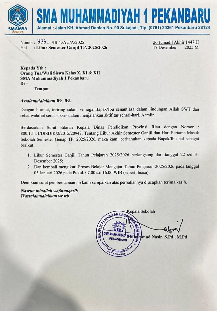 1. Libur Semester Ganjil TP 2025/2026 : 22 - 31 Desember 2025 2. Hari Pertama masuk Sekolah Semester Genap TP : 05 Januari 2026 Pukul 07.00 - 16.00 WIB